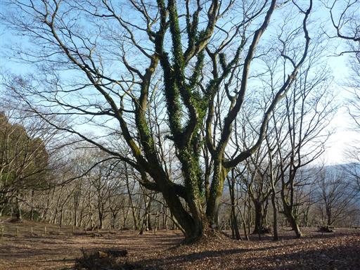 ツルがびっしりと絡み付いている巨木。標識を見ると「エノキ」と書かれている。