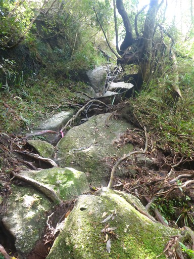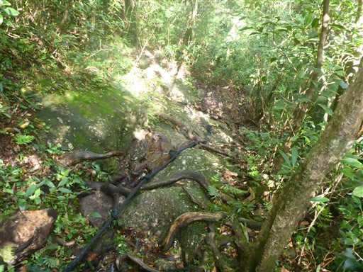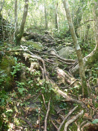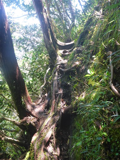 急斜面の登山道は続く。木の根につかまって登っていく。