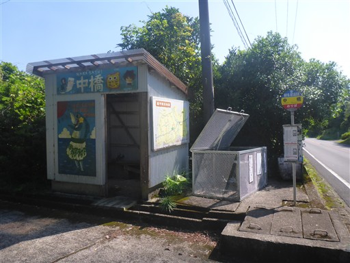 中橋バス停に戻ってくる。バス停の建物にトビウオの絵が描かれている。