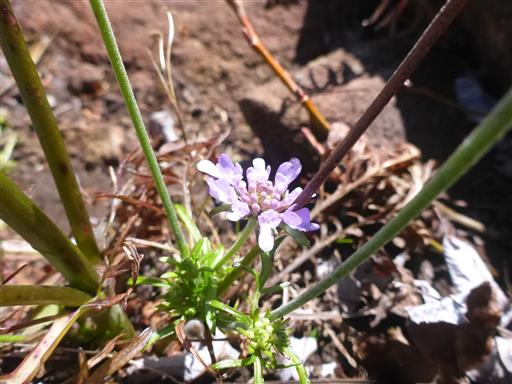 雪の中で一輪だけマツムシソウが寒そうに咲いている。