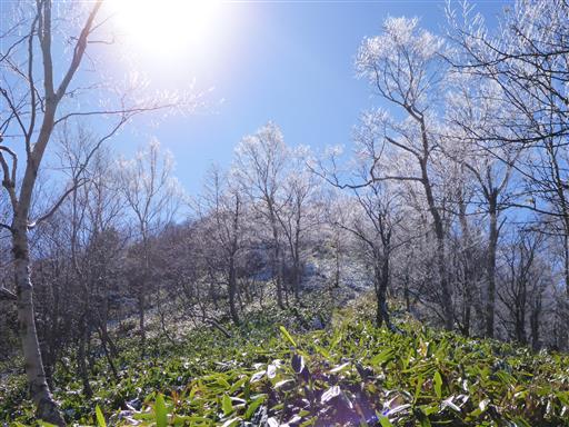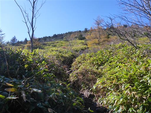 笹原が美しい。案外急斜面の道で、雪が解けてきてドロドロになっている。