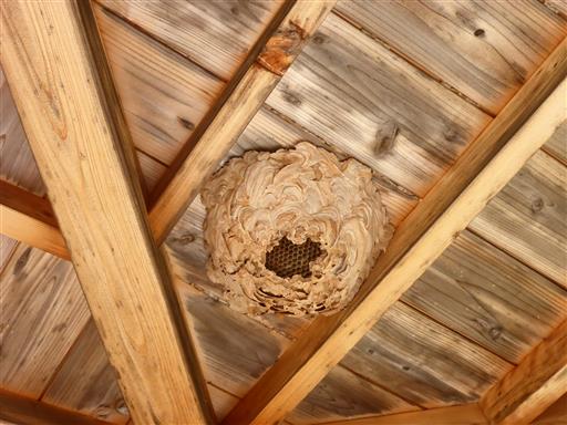 東屋の天井に大きなハチの巣がある。息子が発見。